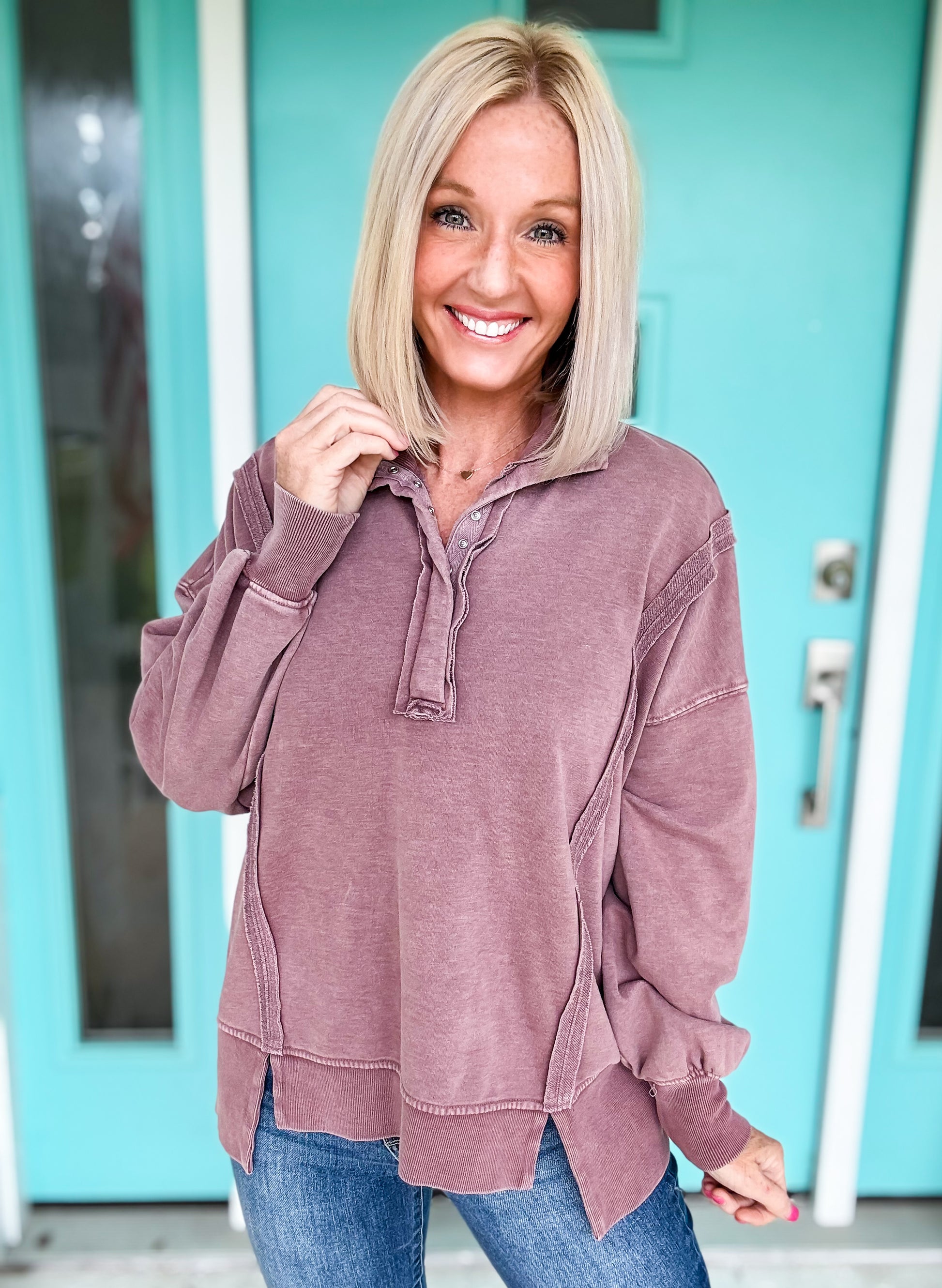 Crafted from mineral-washed French terry fabric, this oversized pullover features a relaxed fit, collared neckline with snap button closure, and exposed seaming details. Perfect for lounging, casual outings or layering.