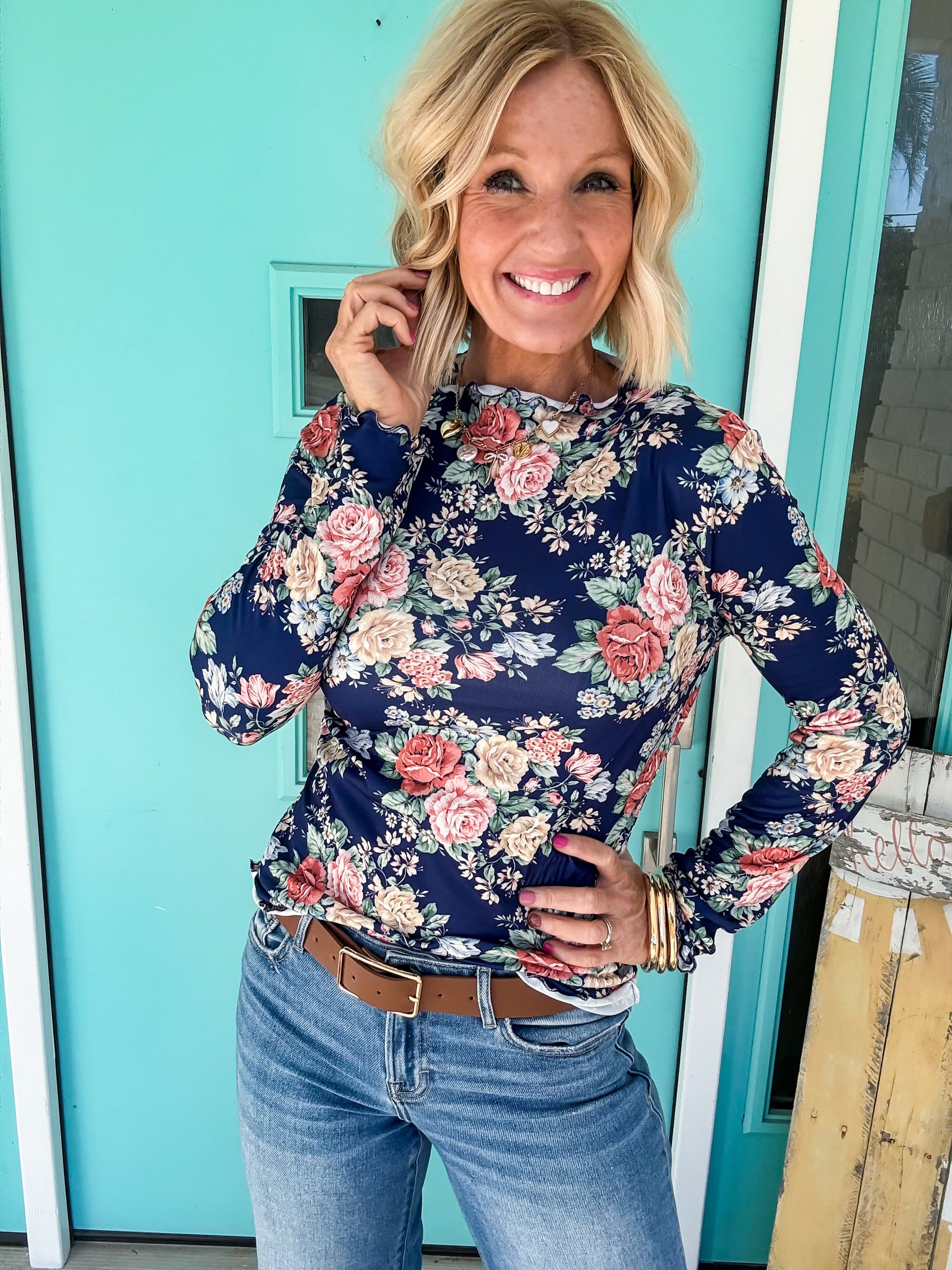 Elevate your everyday style with this charming Blossom & Butter Top! Featuring a delicate floral print and cozy long sleeves, this mock neck beauty is crafted from luxuriously soft butter-like material that feels as good as it looks. Perfect for layering or wearing solo, it's your go-to piece for adding a pop of personality to any outfit. Whether you're heading to brunch or a casual day out, this top brings effortless elegance with a playful twist!