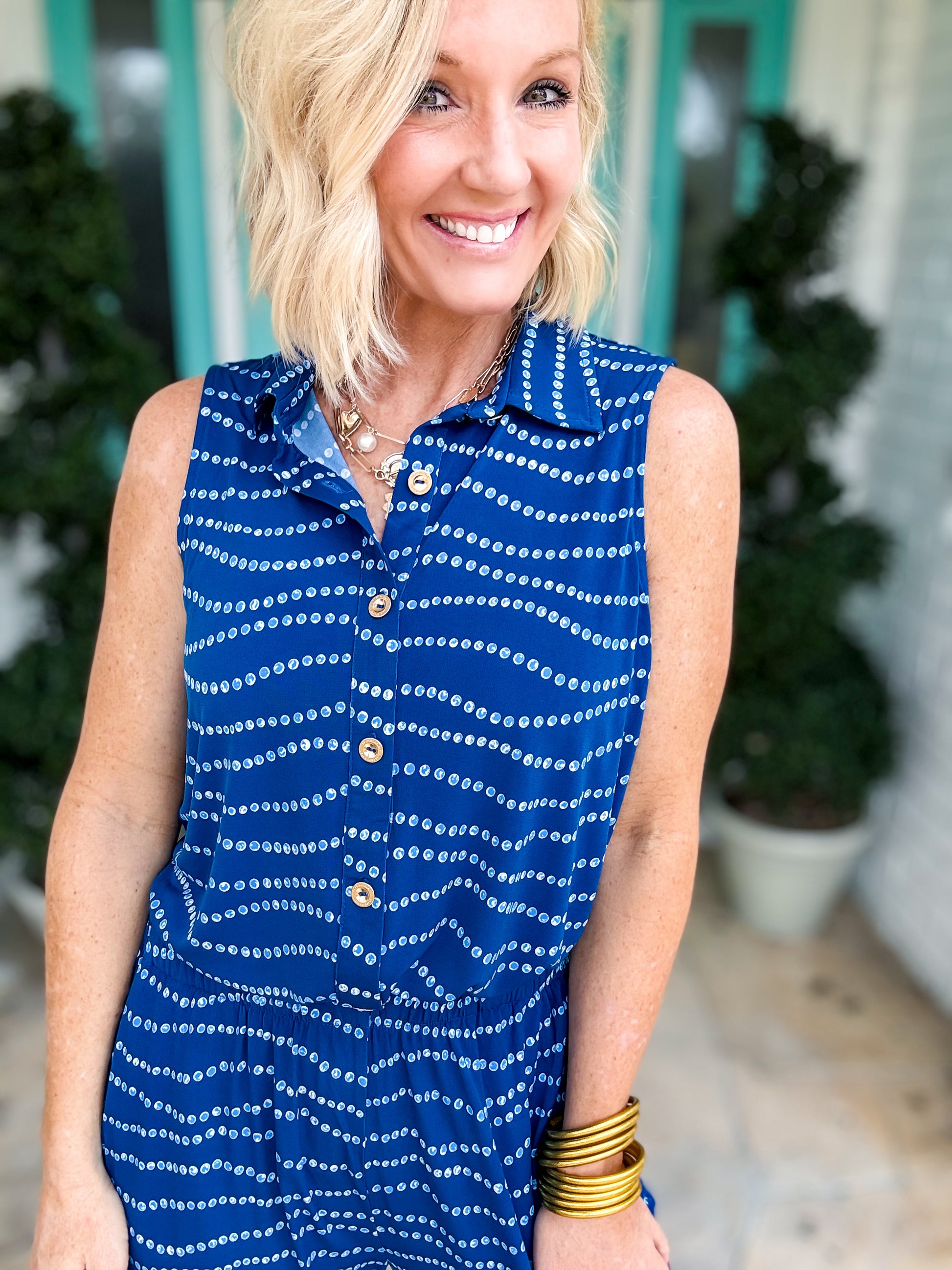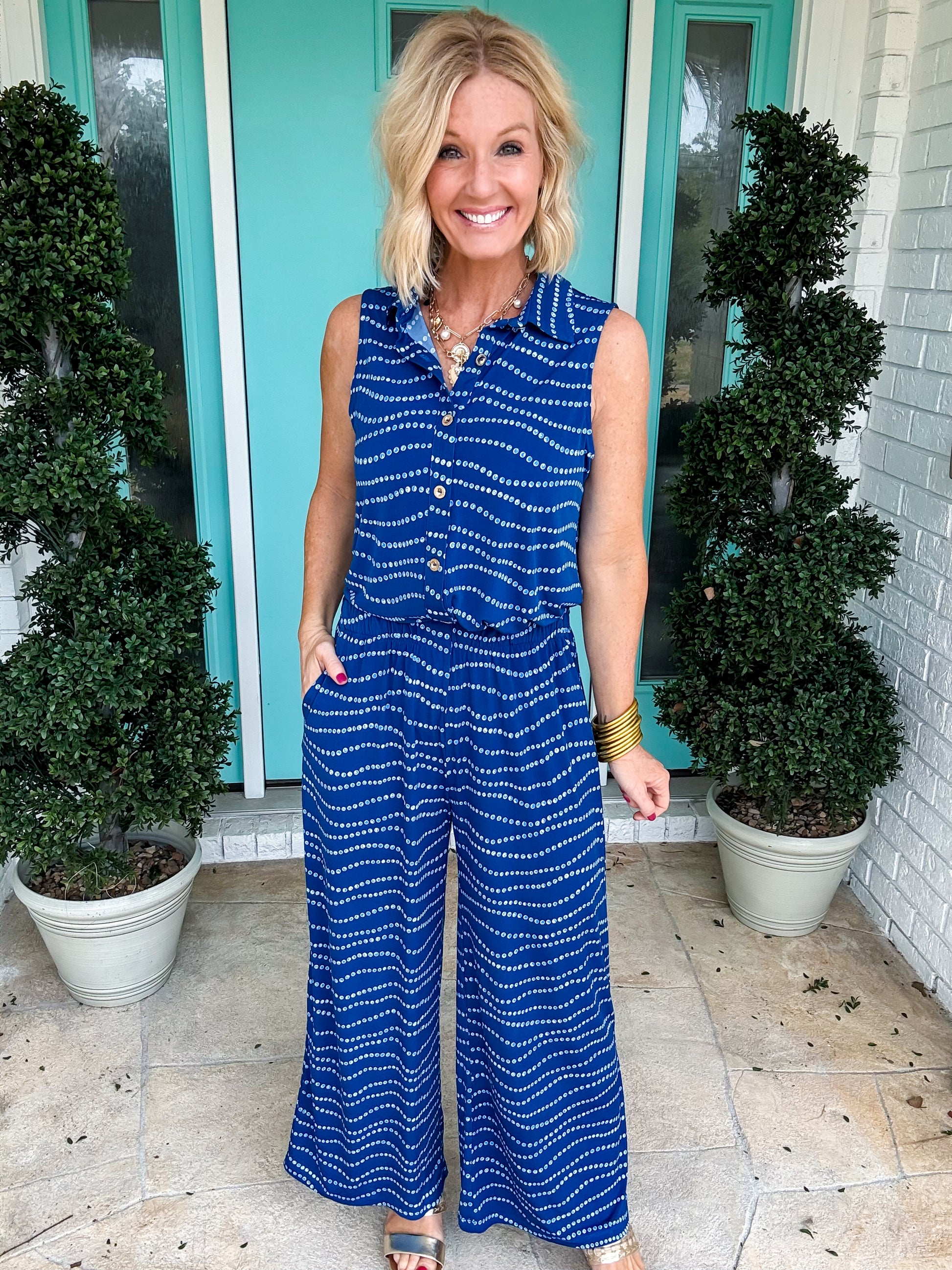 *wrinkle resistant material * This stylish two-piece set is perfect for warm summer days or your next getaway. Featuring a sleeveless blouse with collar detailing and relaxed, loose-fitting pants, it combines comfort and effortless style. Thoughtful button details complete the look for a polished, put-together outfit.