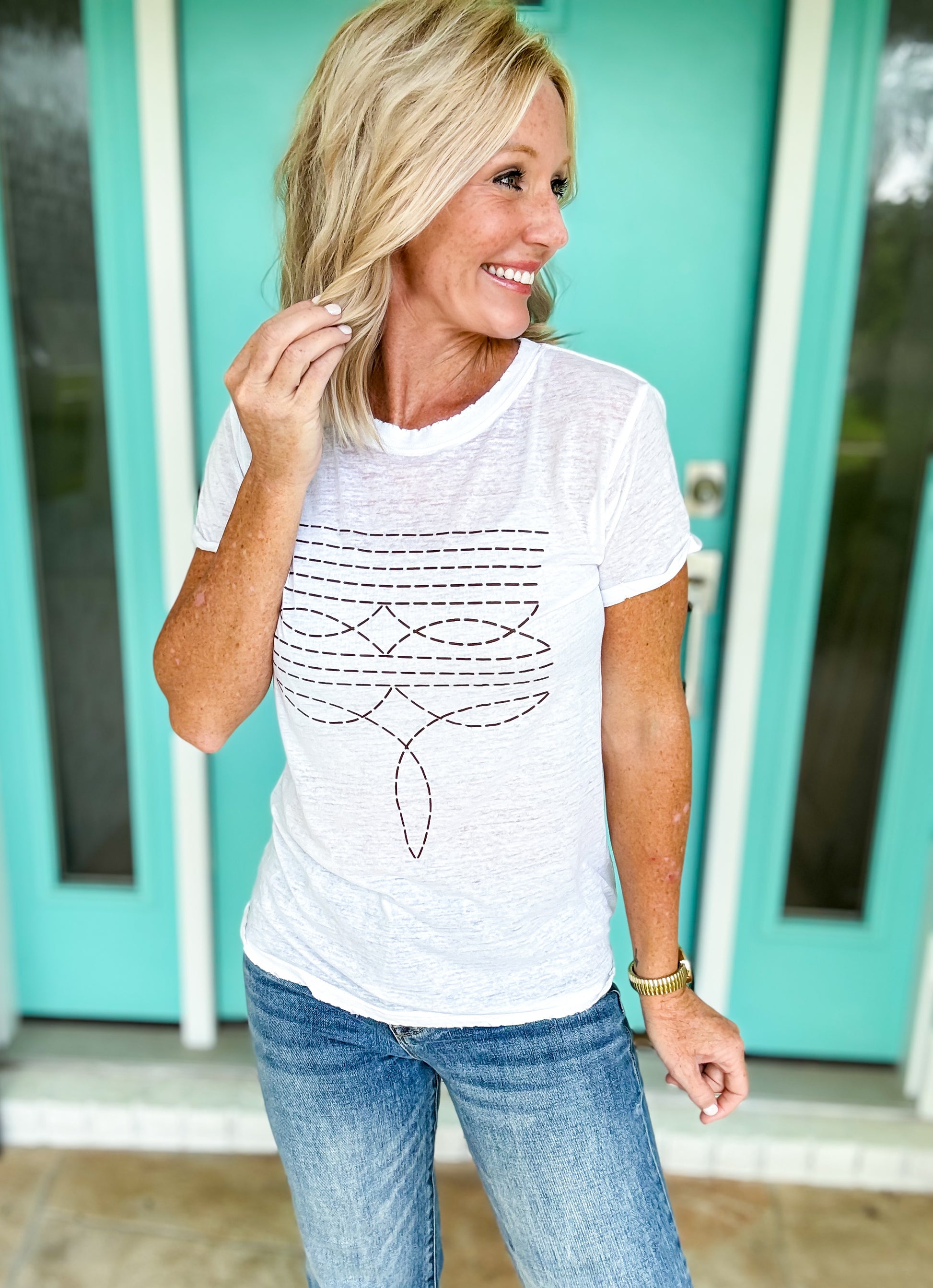 Embrace timeless western style with this Cowboy Boot Stitch Graphic Tee. Featuring a vintage-inspired white cowboy boot toe stitch design, this tee adds authentic flair to your casual wardrobe. Crafted for comfort and style, it’s perfect for those who want to showcase their love for classic cowboy culture with a modern twist.