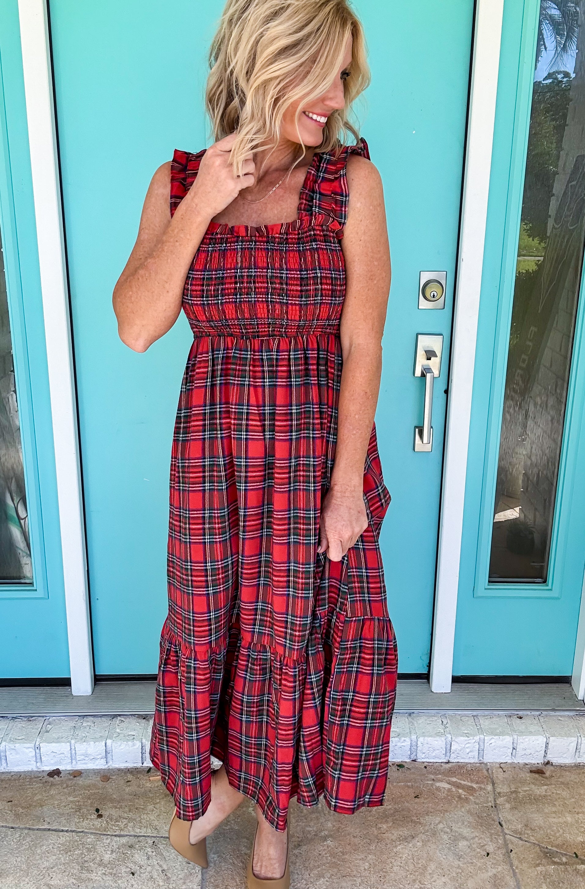 Celebrate the season in style with the Deck the Halls Dress, a stunning plaid midi dress designed for holiday gatherings. The classic plaid pattern brings timeless elegance, while the charming ruffle hem adds a playful touch that catches every eye. Perfect for festive dinners, parties, or seasonal celebrations, this dress combines sophisticated sophistication with festive flair. The midi length offers flattering coverage and versatile styling options—dress it up with heels for an evening event or keep it casual with flats for daytime festivities. Make this your go-to holiday statement piece that transitions seamlessly from Thanksgiving through New Year's celebrations.