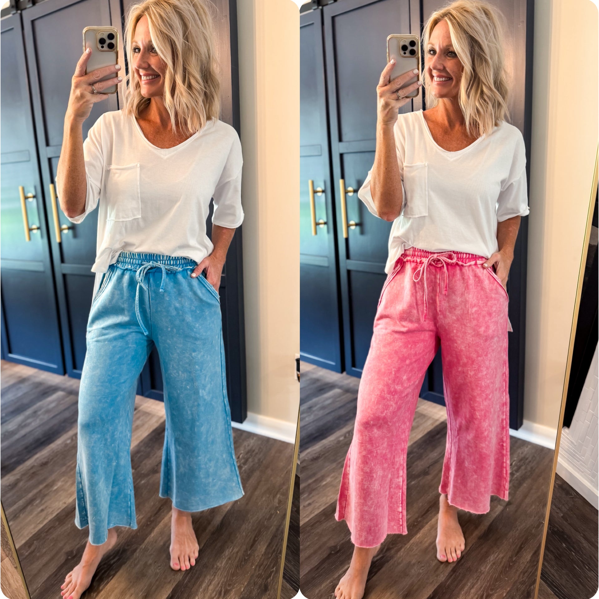 Experience effortless style and comfort with the Easy Edge Pants. Crafted from washed French terry knit, these palazzo pants offer a soft, breathable feel perfect for all-day wear. The relaxed wide-leg design enhances movement, while convenient pockets add practical functionality. Elevate your casual wardrobe with these versatile pants that blend comfort and chic with ease.