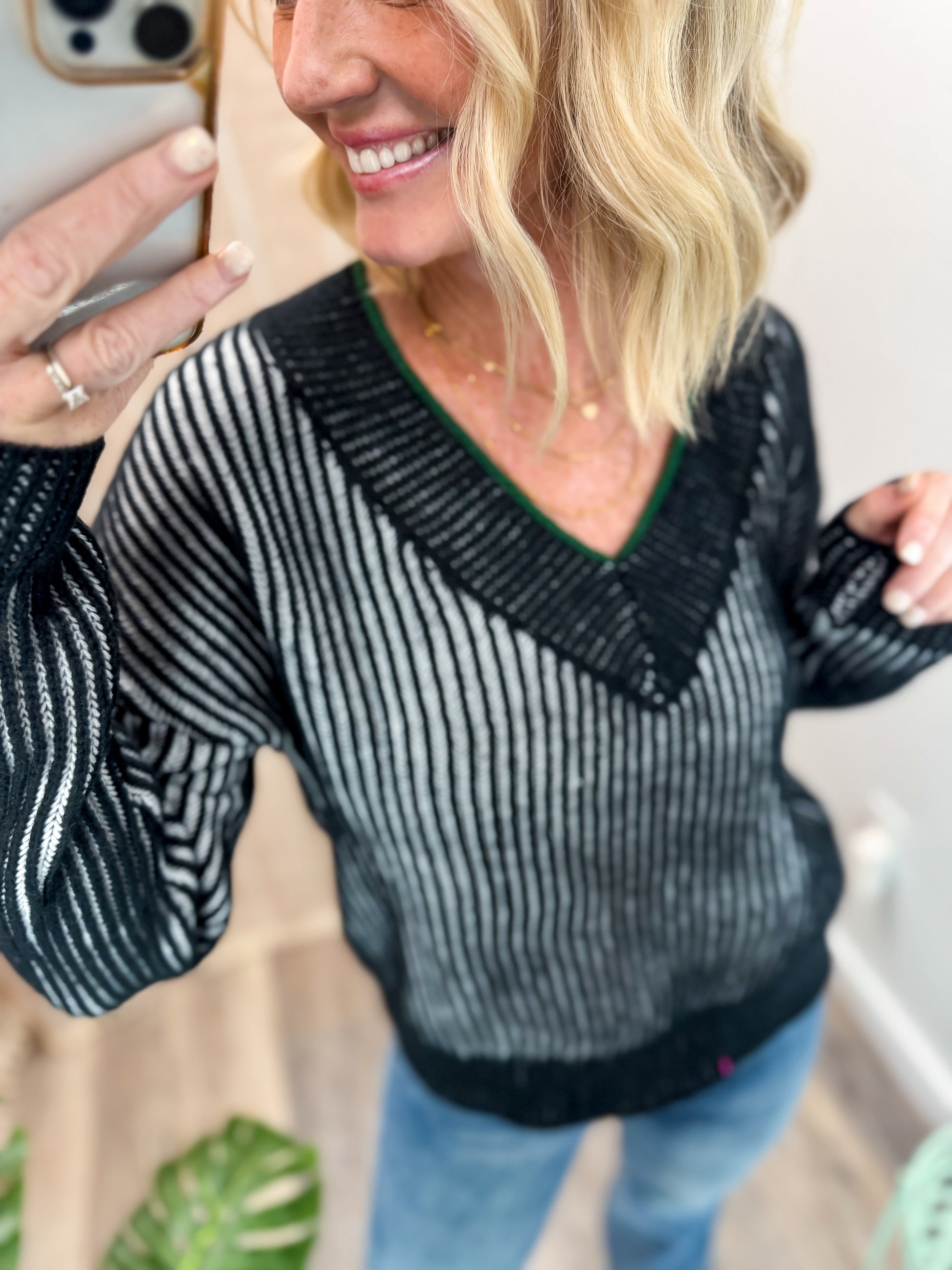 Elevate your everyday wardrobe with this striking black and white sweater, accented by sophisticated green trim that adds a pop of color and personality. The classic color-blocking creates a modern silhouette that pairs effortlessly with your favorite jeans or trousers. Versatile enough for casual outings yet polished enough for the office, this piece becomes an instant go-to for layering through the seasons. The contrasting emerald details draw the eye and make a subtle style statement without overwhelming your look. Perfect for anyone seeking timeless appeal with contemporary edge.