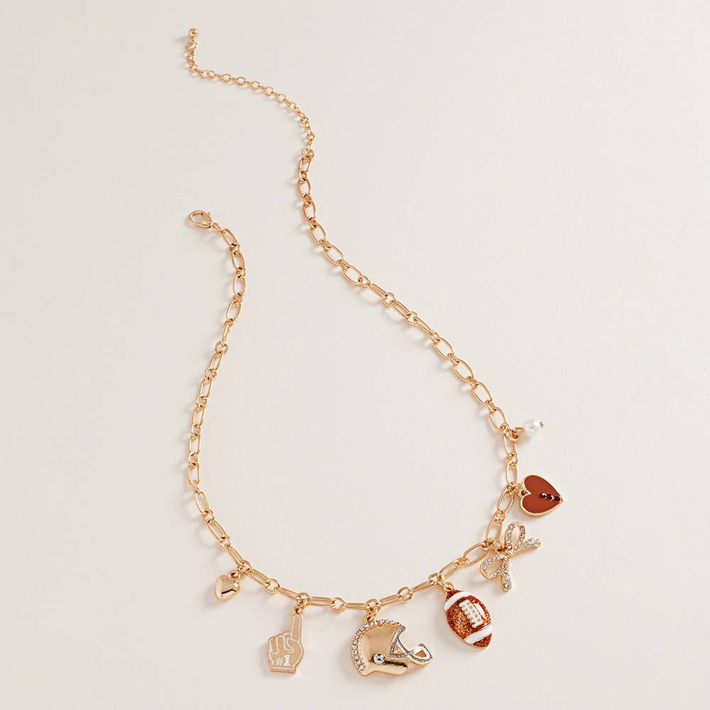 Stylish necklace featuring football-themed charms including a helmet, ball, and fan icons. Perfect accessory for game days, sports fans, or gifting occasions. Adds a fun athletic touch to any outfit.