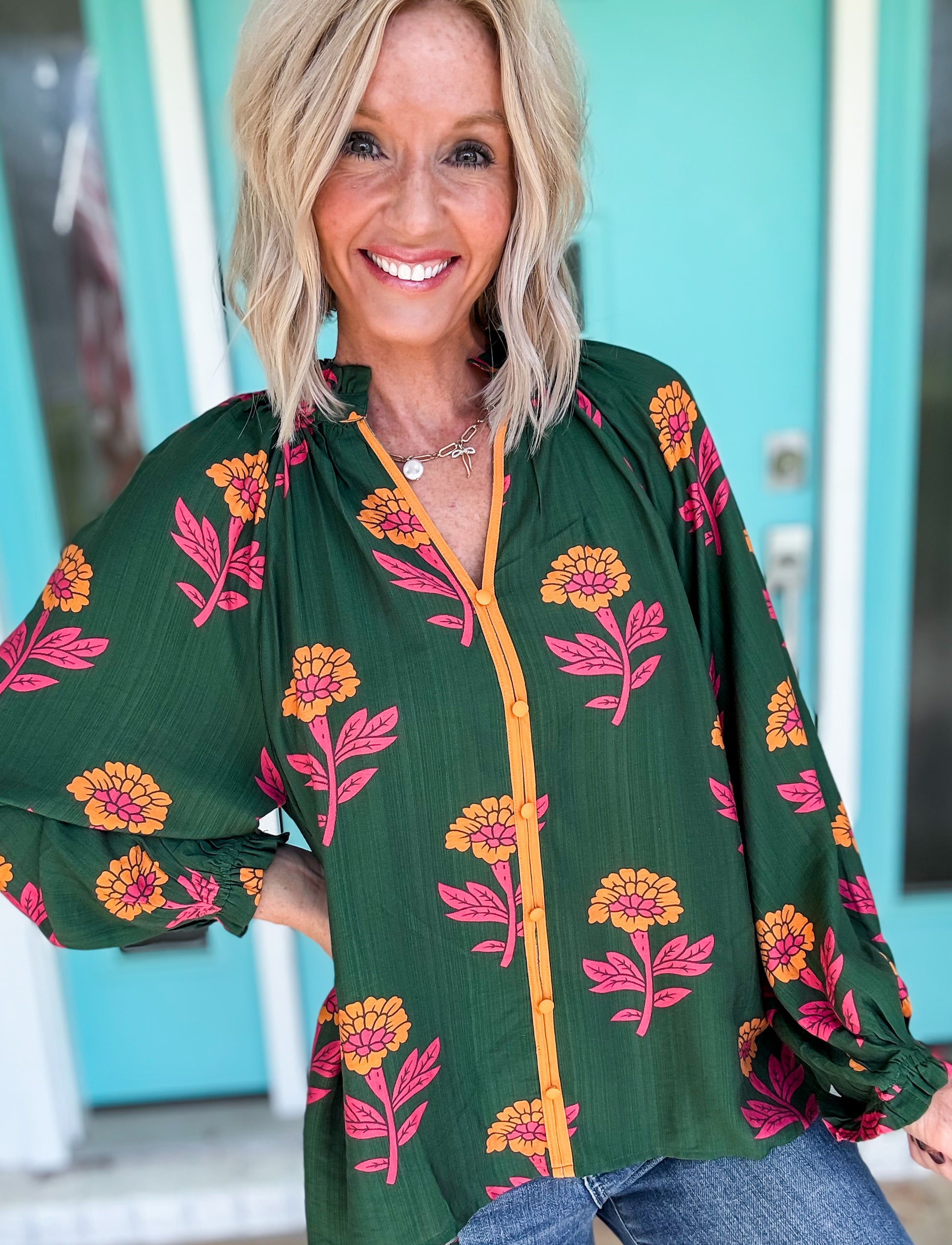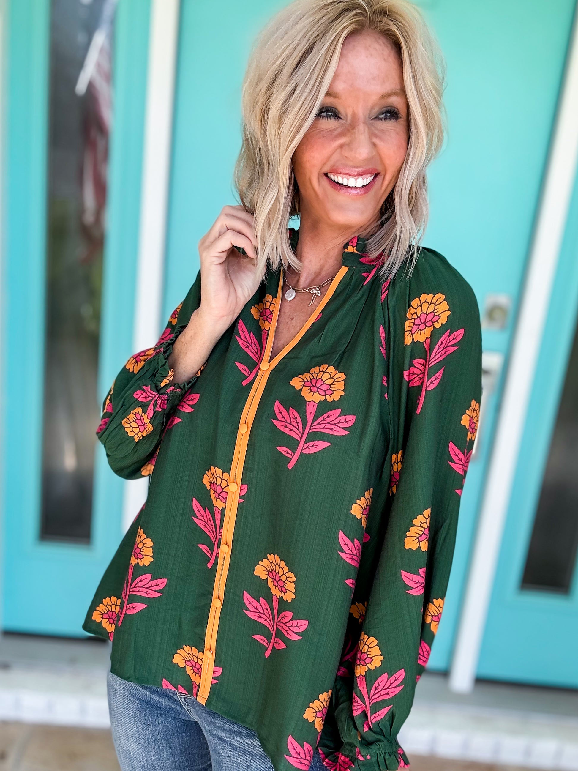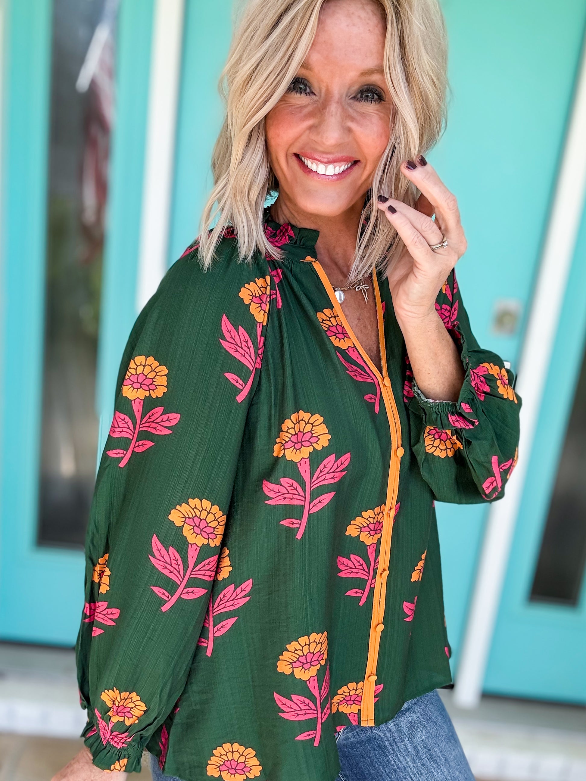 Embrace timeless elegance with the Garden Mosaic Top, featuring a captivating green mix flower block print. This top brings nature-inspired beauty to your wardrobe, effortlessly elevating your look with its vibrant, fresh pattern. Perfect for any occasion, it pairs seamlessly with jeans or skirts, offering a comfortable yet stylish choice that brightens your day. Transform your outfit with this floral statement piece designed to enhance your natural charm.
