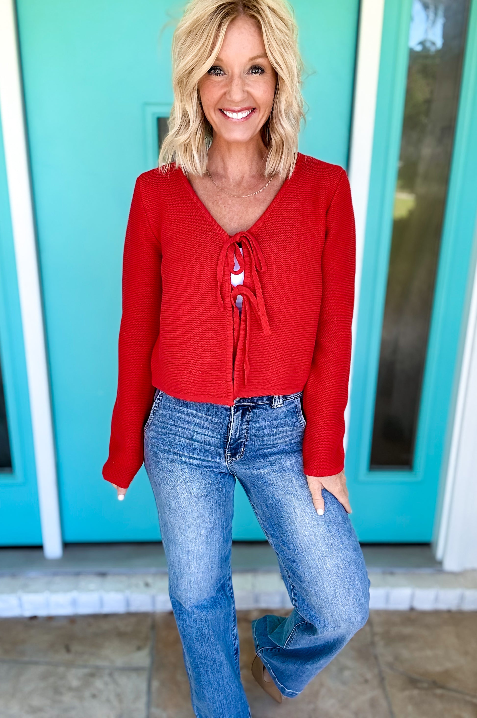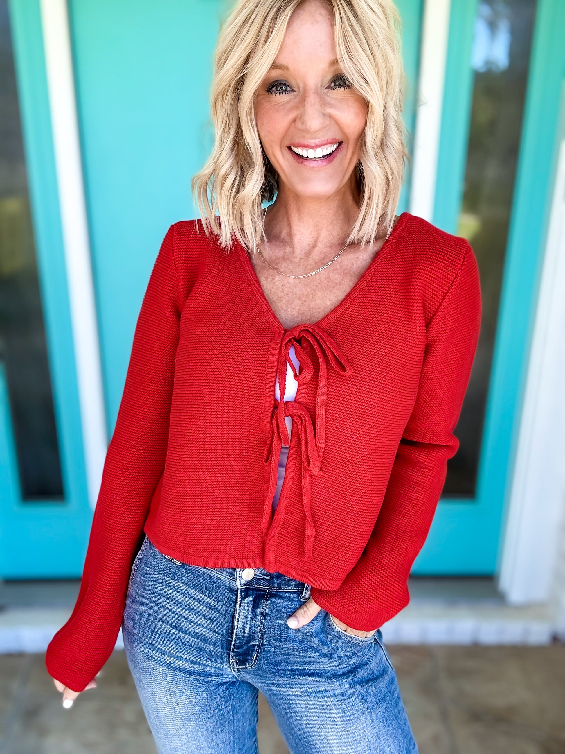 Elevate your wardrobe with this vibrant red tie-front sweater cardigan. Crafted for a flattering fit, its soft knit fabric offers cozy warmth without sacrificing style. The front tie detail adds a chic and adjustable touch, perfect for layering over your favorite tops. Ideal for both casual outings and relaxed office days, this cardigan brings effortless charm and a pop of color to any outfit.