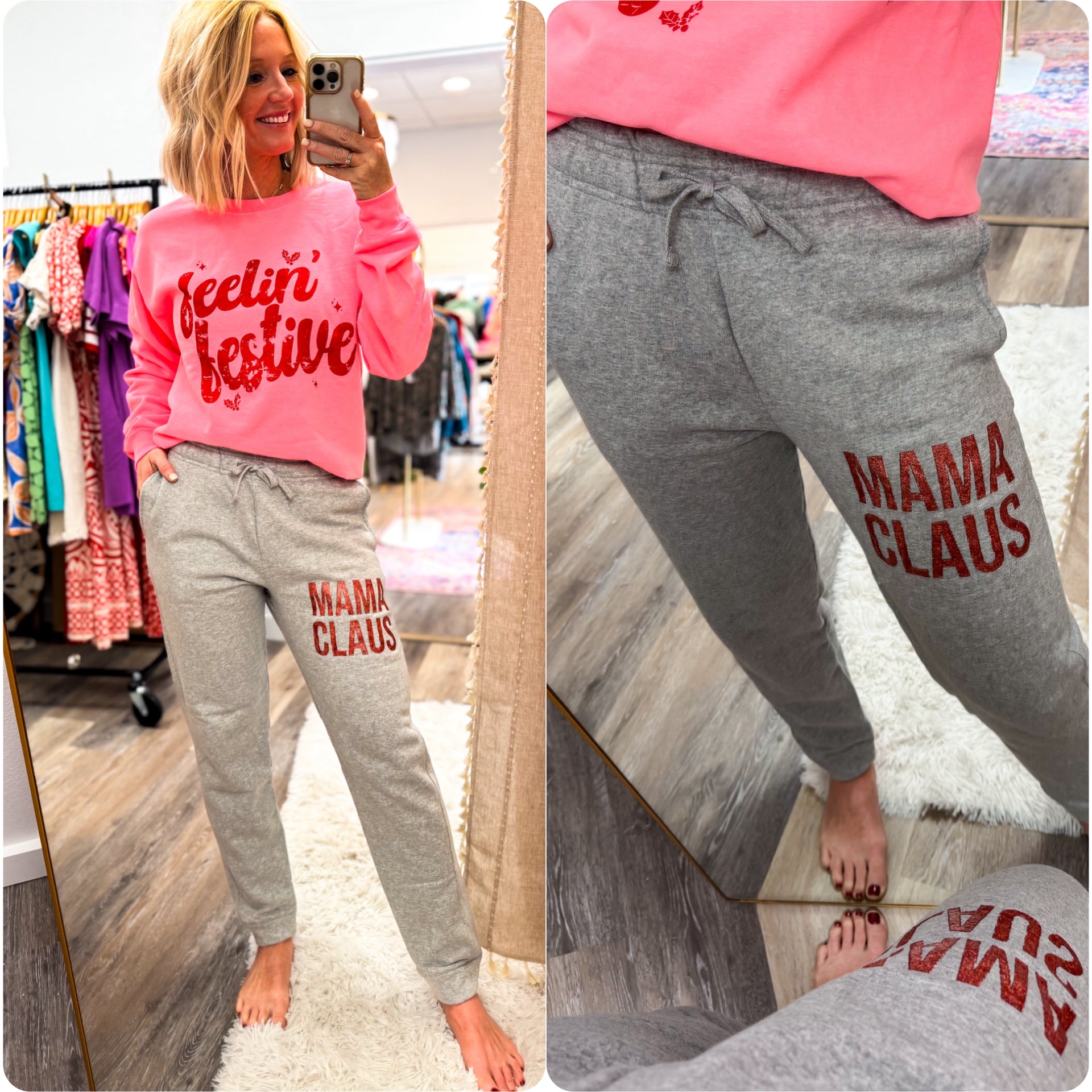 Rock your holiday season with our MAMA Claus joggers. Perfect for Christmas morning with its cozy design and festive spirit. Treat yourself or gift it to a fellow mama for an extra special Christmas surprise!