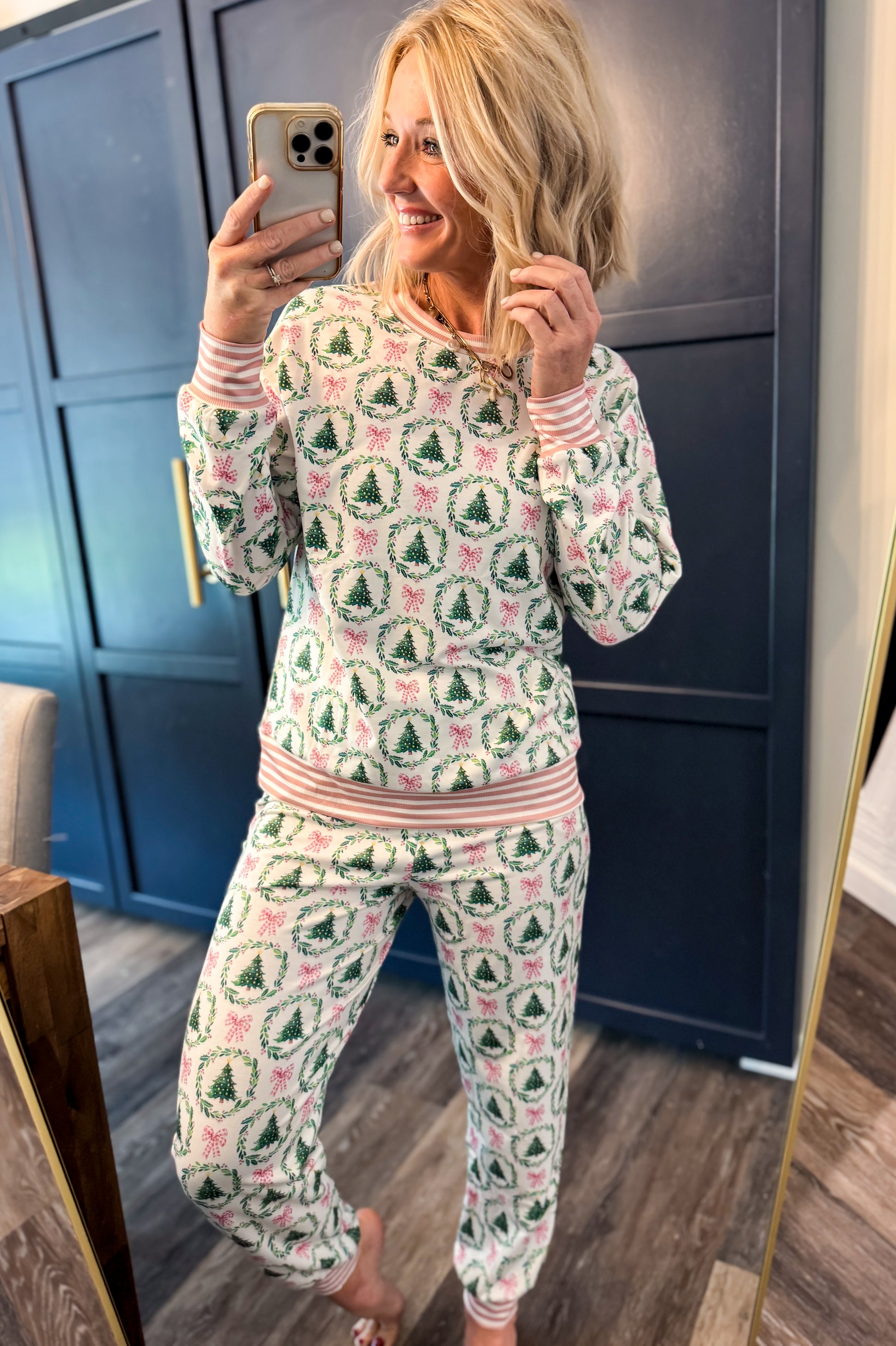 Embrace festive elegance with our Merry In Pink Bows Lounge Set, a charming blend of holiday spirit and everyday comfort. This delightful set features playful bows, cheerful stripes, and whimsical Christmas tree details that capture the magic of the season. Made from soft, skin-friendly fabric, it's designed for all-day wear whether you're relaxing at home or enjoying holiday gatherings. The thoughtful design details make this more than just loungewear—it's a wearable celebration that brings joy to your seasonal wardrobe. Slip into comfort and festive flair that you'll love wearing all winter long.