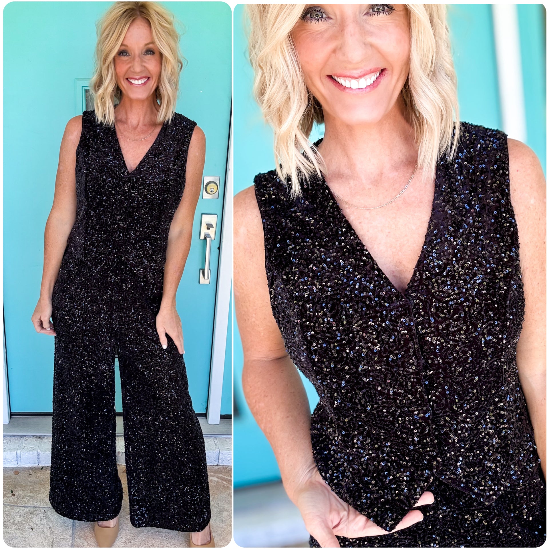 Make every outfit shine with the Midnight Glimmer Vest. Covered in sleek black sequins, this vest adds a bold touch of sparkle and sophistication to your look. Perfect for nights out or special occasions, it effortlessly elevates any ensemble while maintaining a chic, modern edge. Stand out with this versatile statement piece that brings glamour to your wardrobe.