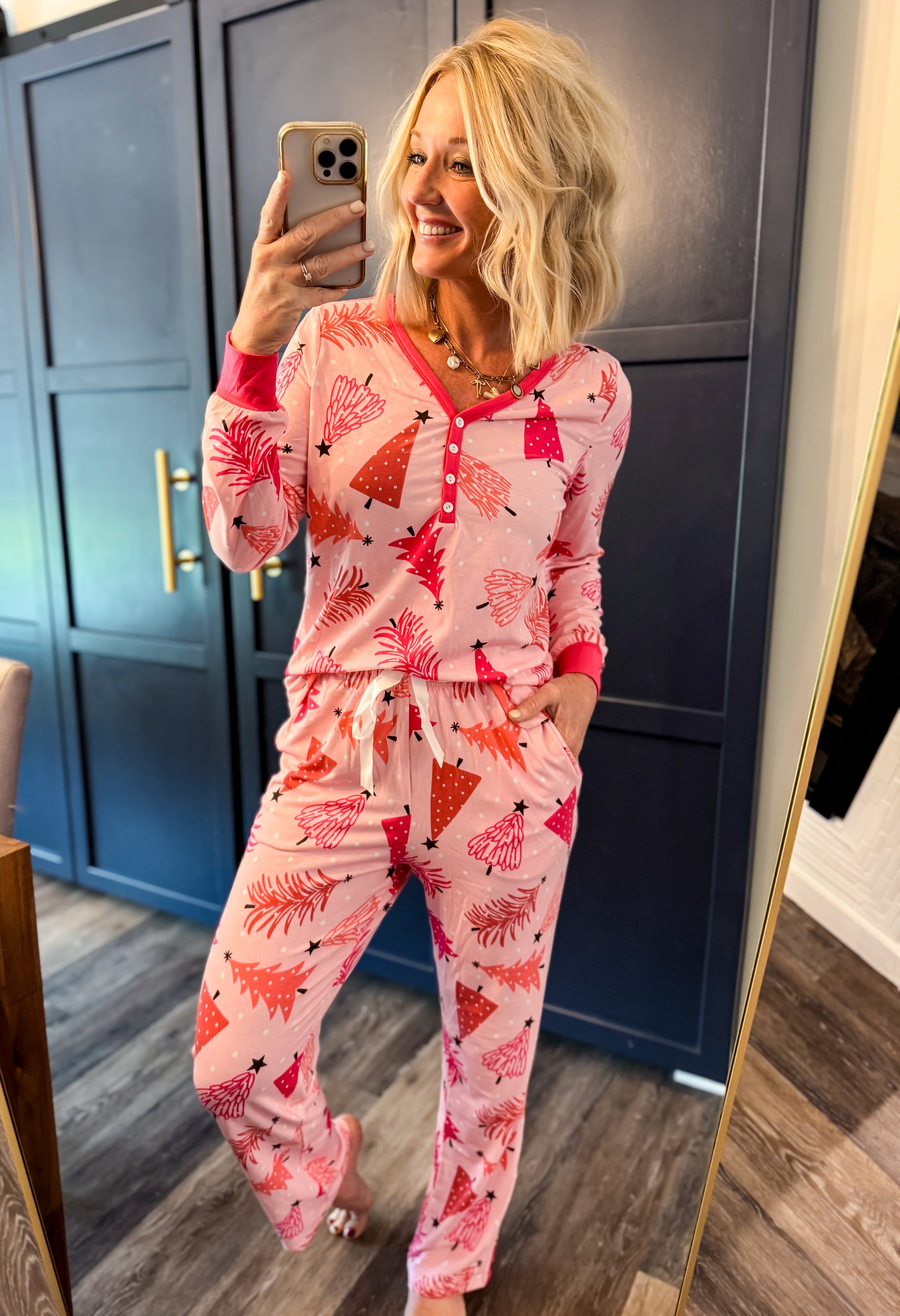 Embrace the holiday spirit in style with our Pretty in Pinkmas Lounge Set. Featuring a charming pink base adorned with festive Christmas tree patterns, this cozy ensemble brings together comfort and seasonal cheer. Perfect for relaxed evenings by the fire, holiday gatherings, or simply unwinding in festive fashion. The soft fabric feels luxurious against your skin while the playful design adds a touch of whimsy to your winter wardrobe. Make every moment merry and bright—because comfort and Christmas magic shouldn't be mutually exclusive.