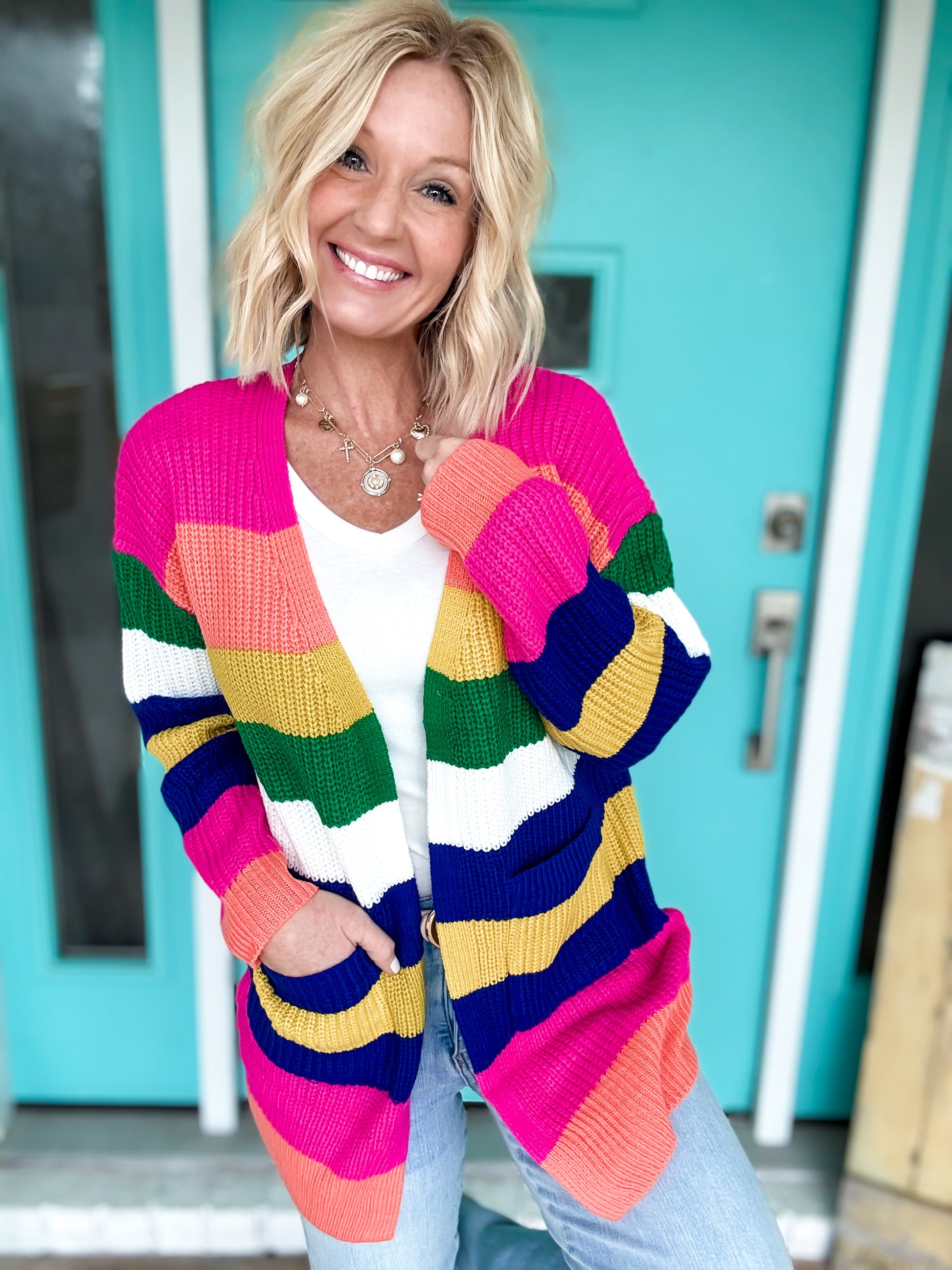Layer up in style with this vibrant rainbow striped cardigan—your spring wardrobe's new best friend! Featuring bold, cheerful stripes in every color of the spectrum, it's perfect for adding a playful pop of personality to any outfit. Lightweight and versatile, throw it over your favorite tee or dress for instant charm. Whether you're heading to brunch or catching up with friends, this cardigan brings the fun wherever you go. Embrace the season with color!