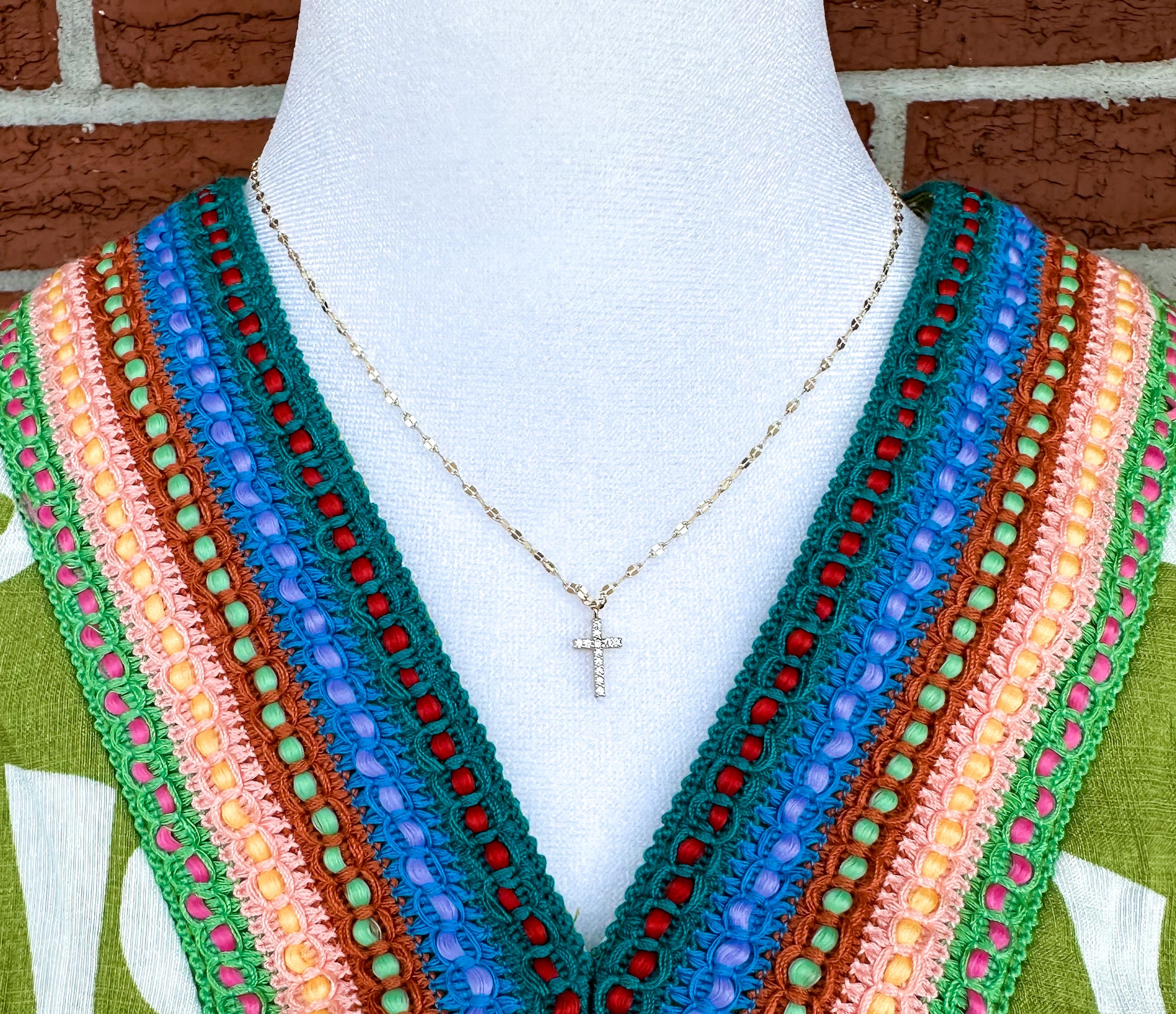 Gold chain with rhinestone cross.