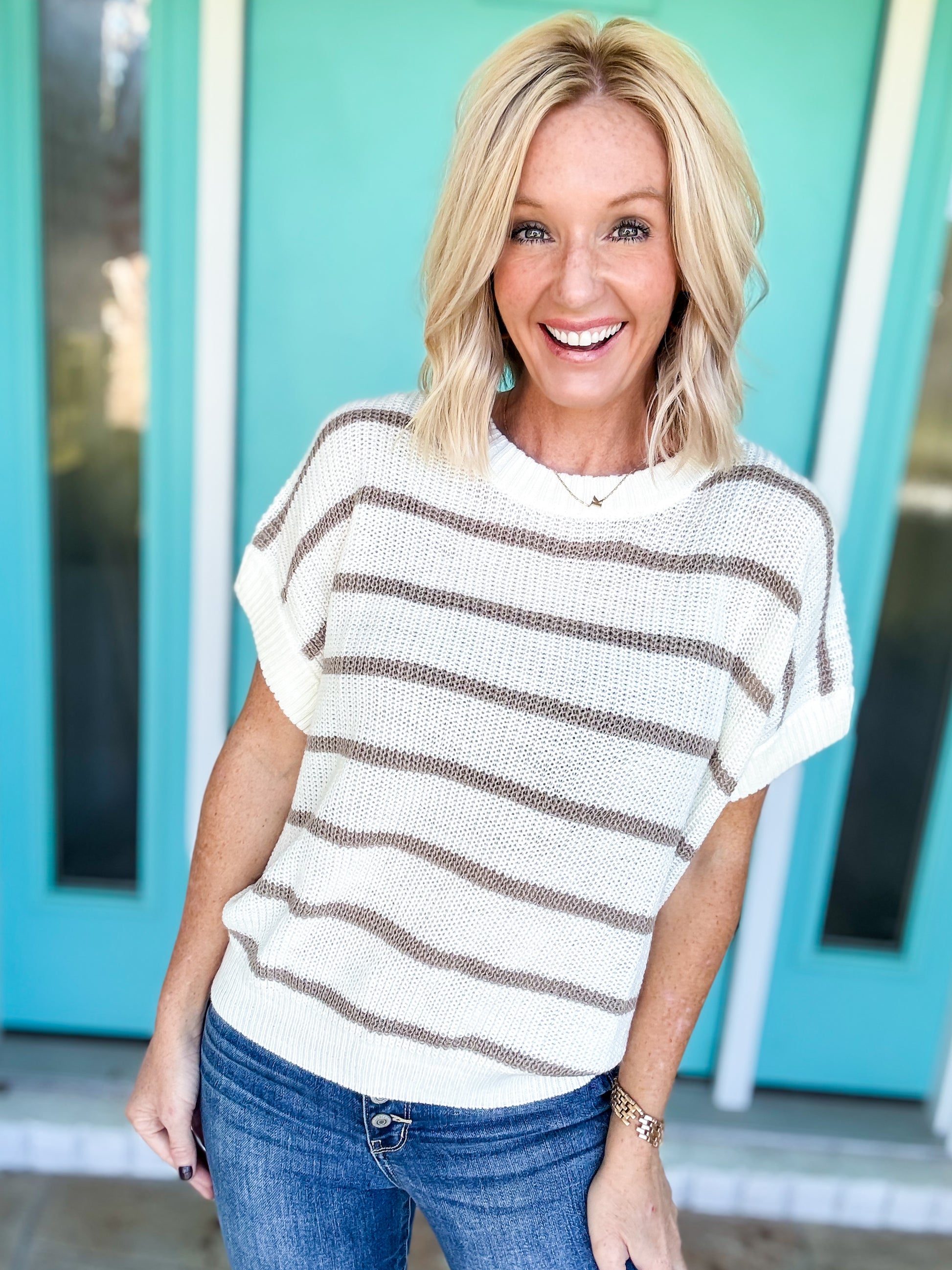 Elevate your everyday look with the Rustle Stripes Sweater. Featuring bold horizontal stripes and a comfortable short sleeve design, this sweater effortlessly blends style and ease. Its lightweight fabric keeps you cool while adding a chic touch to any outfit, making it perfect for layering or wearing on its own. Embrace casual sophistication with this versatile wardrobe essential.