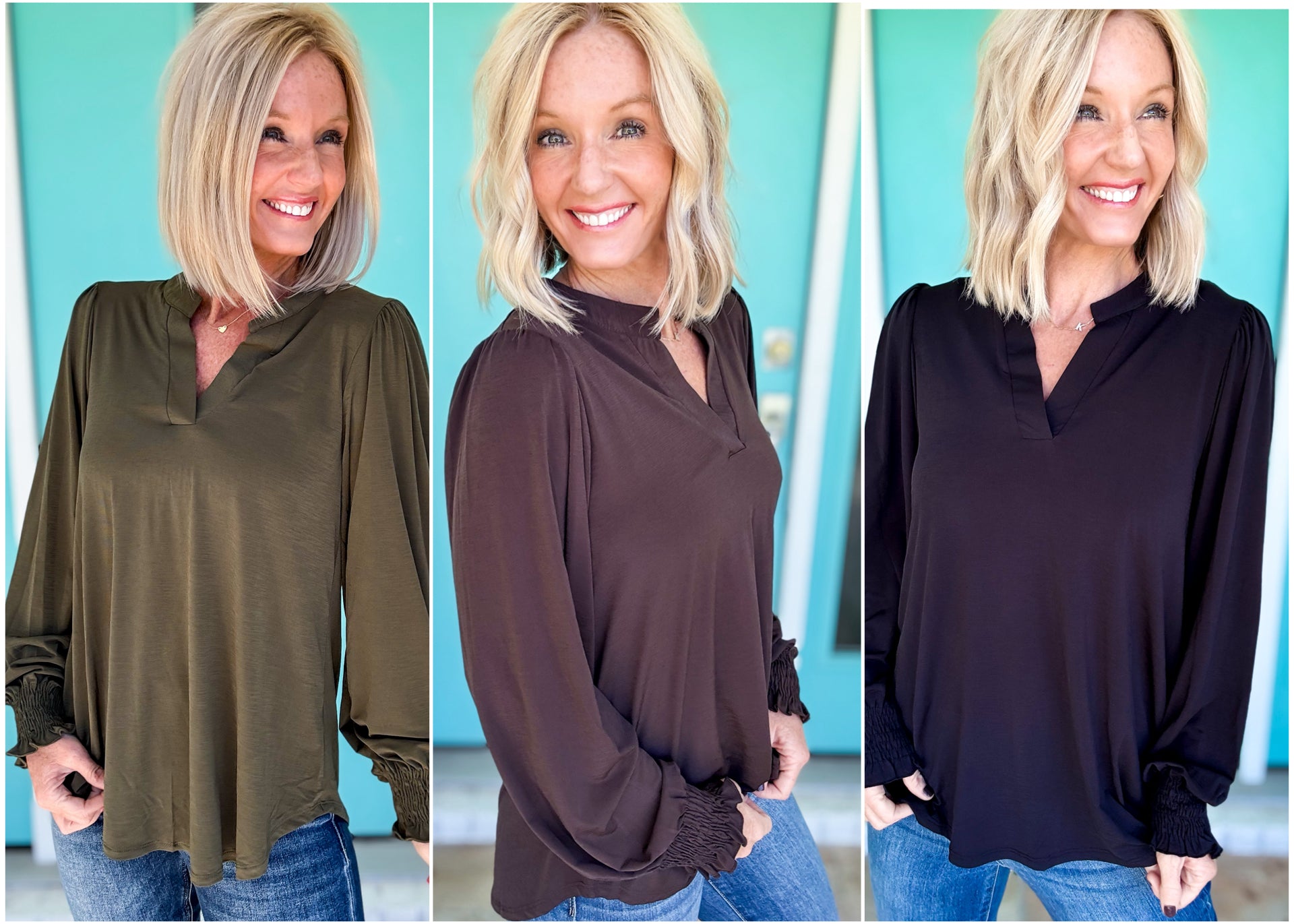 Elevate your wardrobe with the Simply Smocked Sleeve Top, featuring elegant smocked sleeves and a smooth, solid color design. Crafted from wrinkle-free fabric, this top keeps you looking polished all day without the hassle of ironing. Its comfortable fit and timeless style make it perfect for both casual outings and professional settings. Experience effortless sophistication and lasting comfort in one versatile piece.