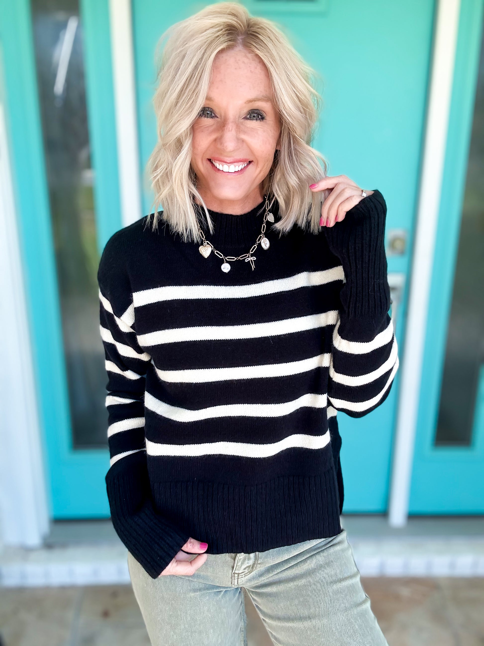 Step into style with our Classic Stripe Chic Sweater! This black and white striped sweater brings a playful touch to any outfit. Stay cozy and look effortlessly chic with this must-have piece.