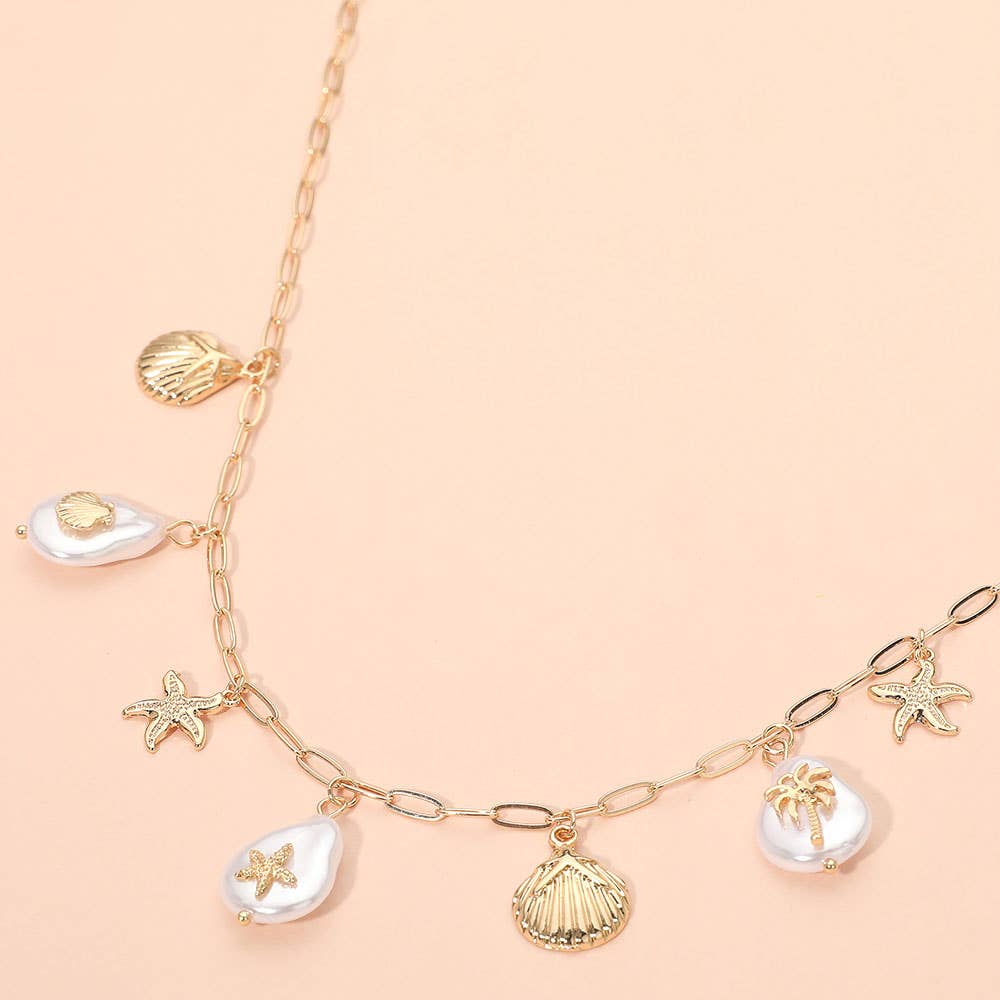 Starfish Shell Palm Tree Pearl Charm Station Paperclip Chain Necklace