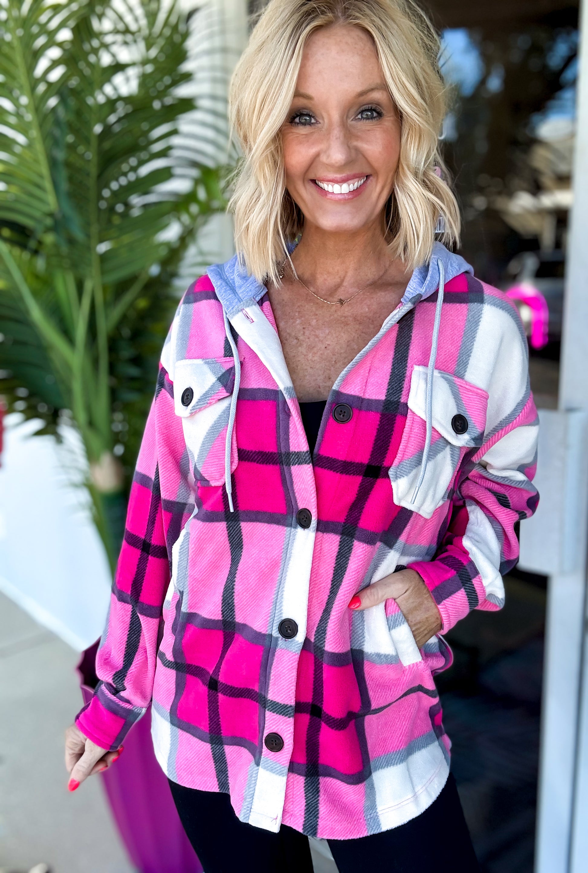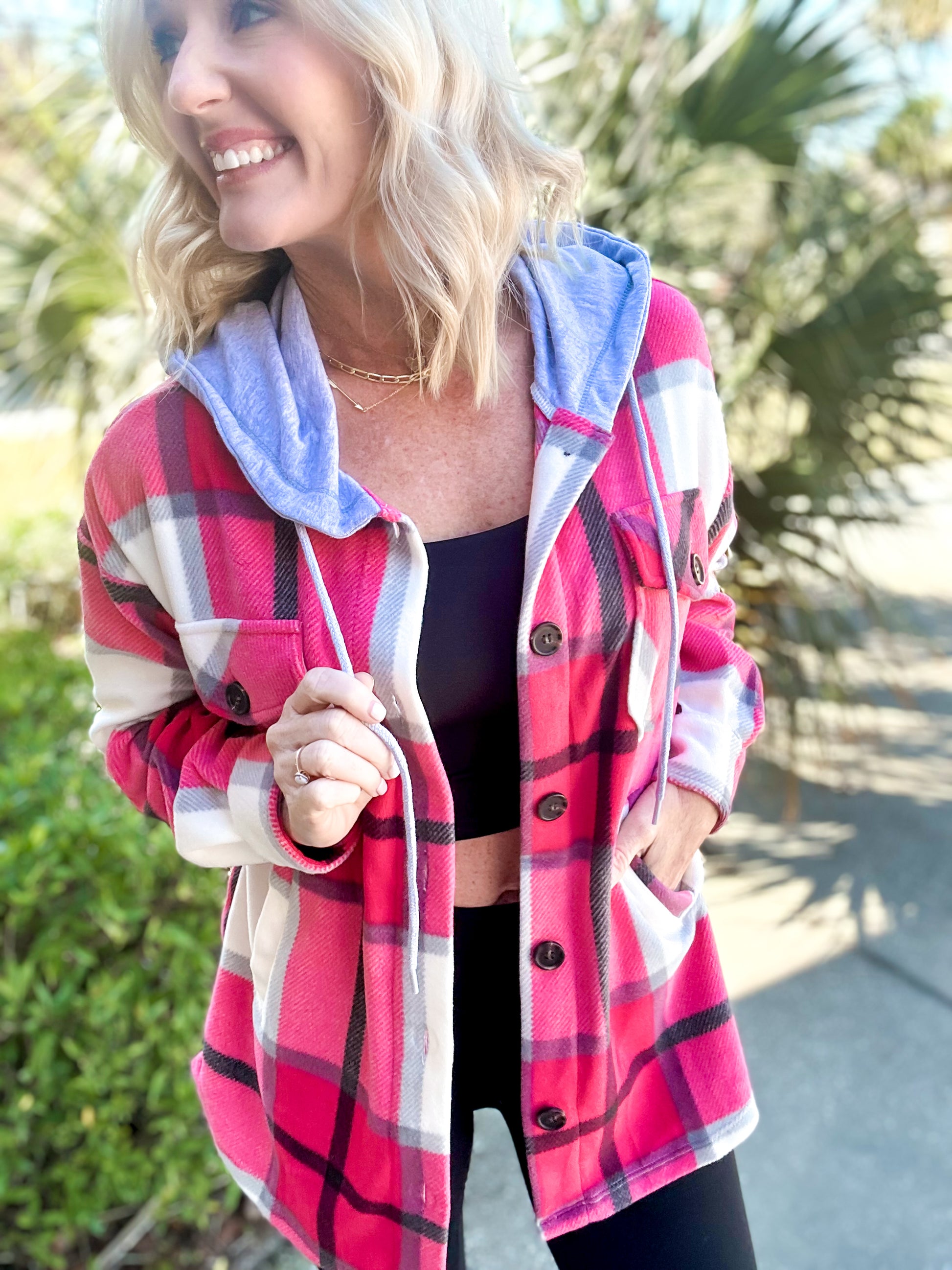 Be the envy of all of your friends with The Audrey Hooded Shacket. This plaid hooded fleece shacket is perfect for any look whether you dress it up or dress it down. The drawstring hood is just the cherry on top of this stylish dream.
