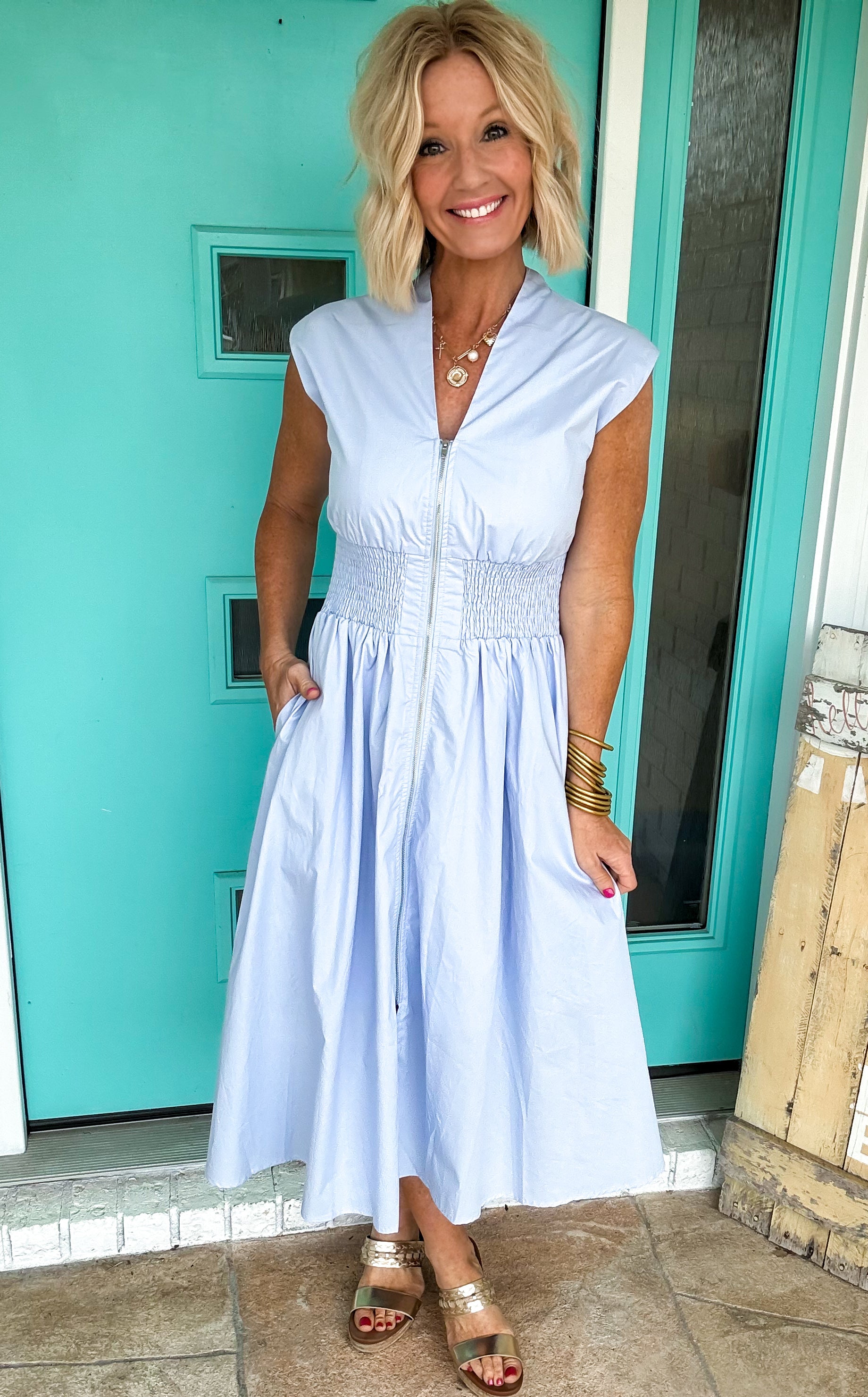 InEmbrace the season in this charming smocked waist dress, designed to brighten your spring wardrobe. The fitted smocked detail cinches at the waist while a playful zipper accent adds modern flair. Available in vibrant colors that pop, this versatile piece transitions effortlessly from casual outings to weekend adventures. The comfortable fit and cheerful palette make it a go-to favorite for sunny days ahead.