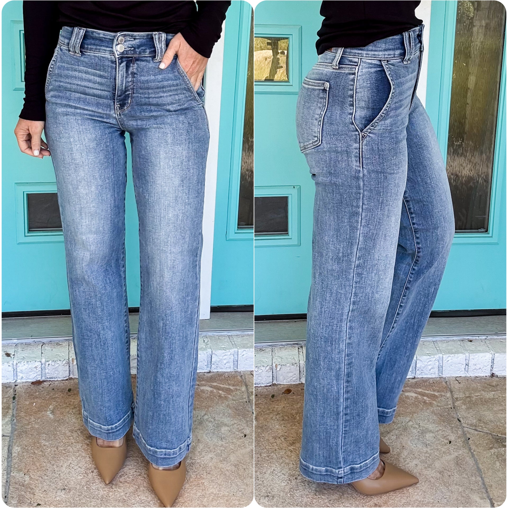 The Theresa Trouser Pants by Judy Blue bring effortless sophistication to your everyday wardrobe. Featuring a flattering trouser silhouette with a distinctive double button closure, these jeans offer a polished look that transitions seamlessly from office to weekend. Crafted with Judy Blue's signature quality denim, they provide the comfort and durability you'll love wearing again and again. The tailored fit creates a sleek, elongating line while maintaining the ease of your favorite jeans. Elevate your style with a versatile piece that works as hard as you do.