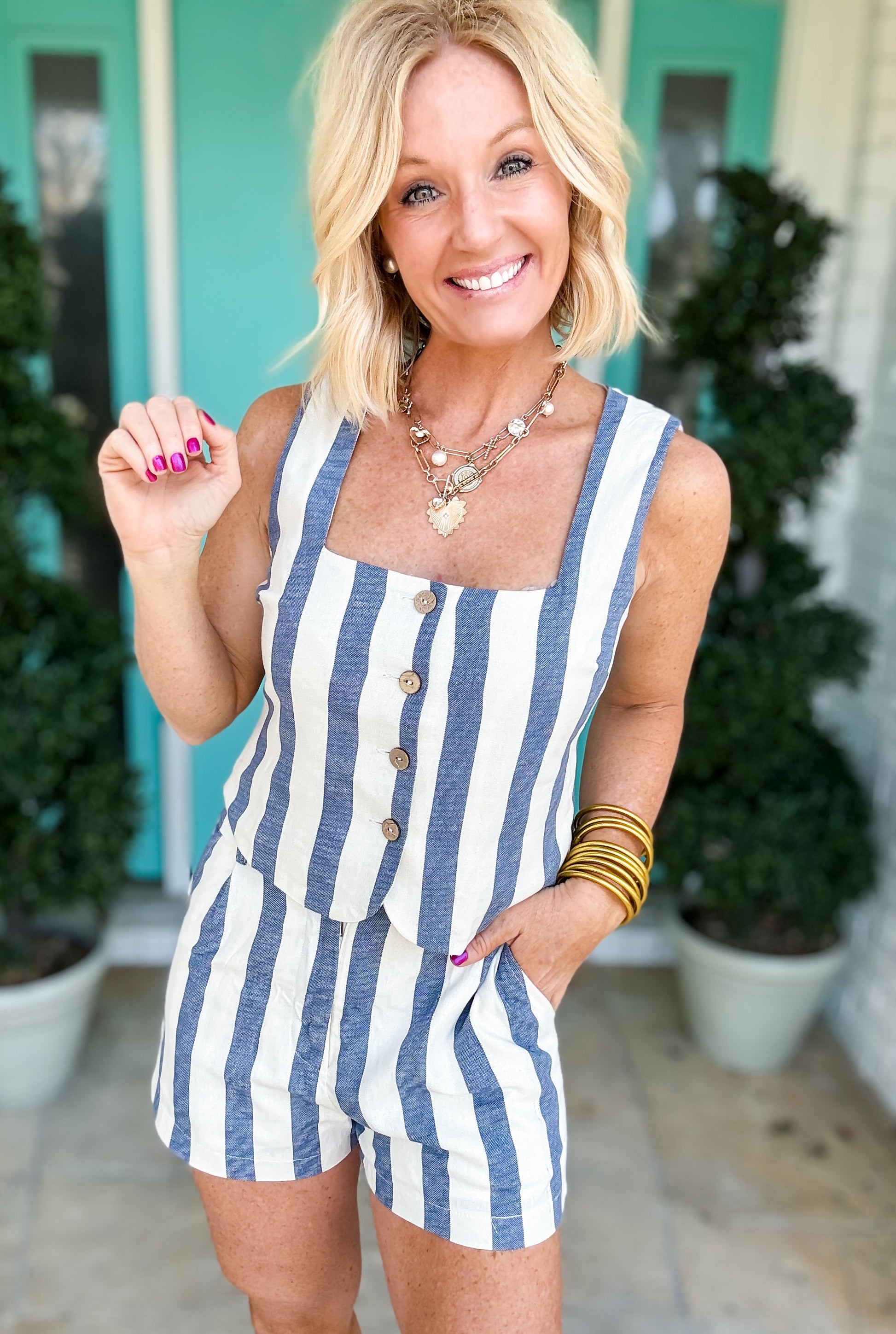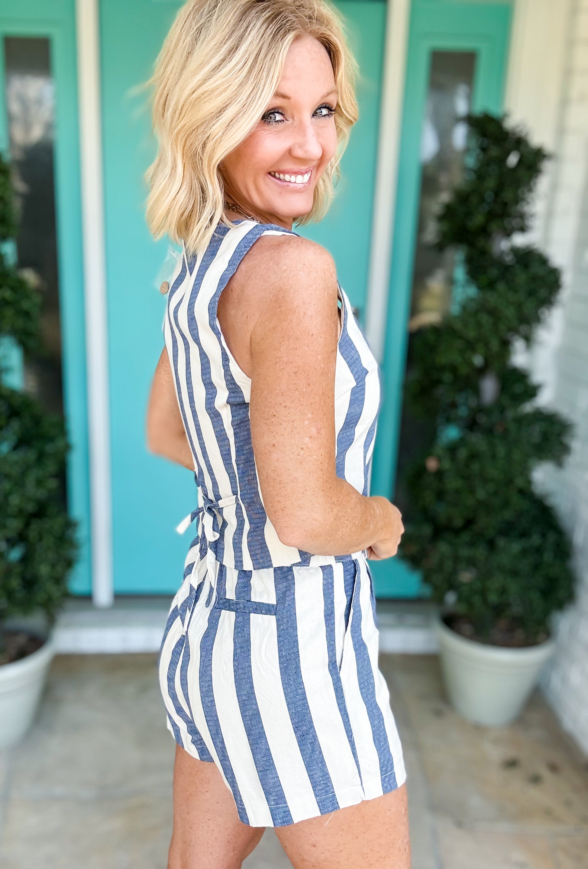 Mix and match your way to summer style with The Workshop Striped Set. This playful three-piece ensemble features a classic striped pattern across a button-up tank vest, coordinating trouser shorts, and a versatile companion piece. Perfect for creating multiple looks from one cohesive set, whether you're dressing up for brunch or keeping it casual for weekend adventures. Stripes never go out of style—make them work harder in your wardrobe.