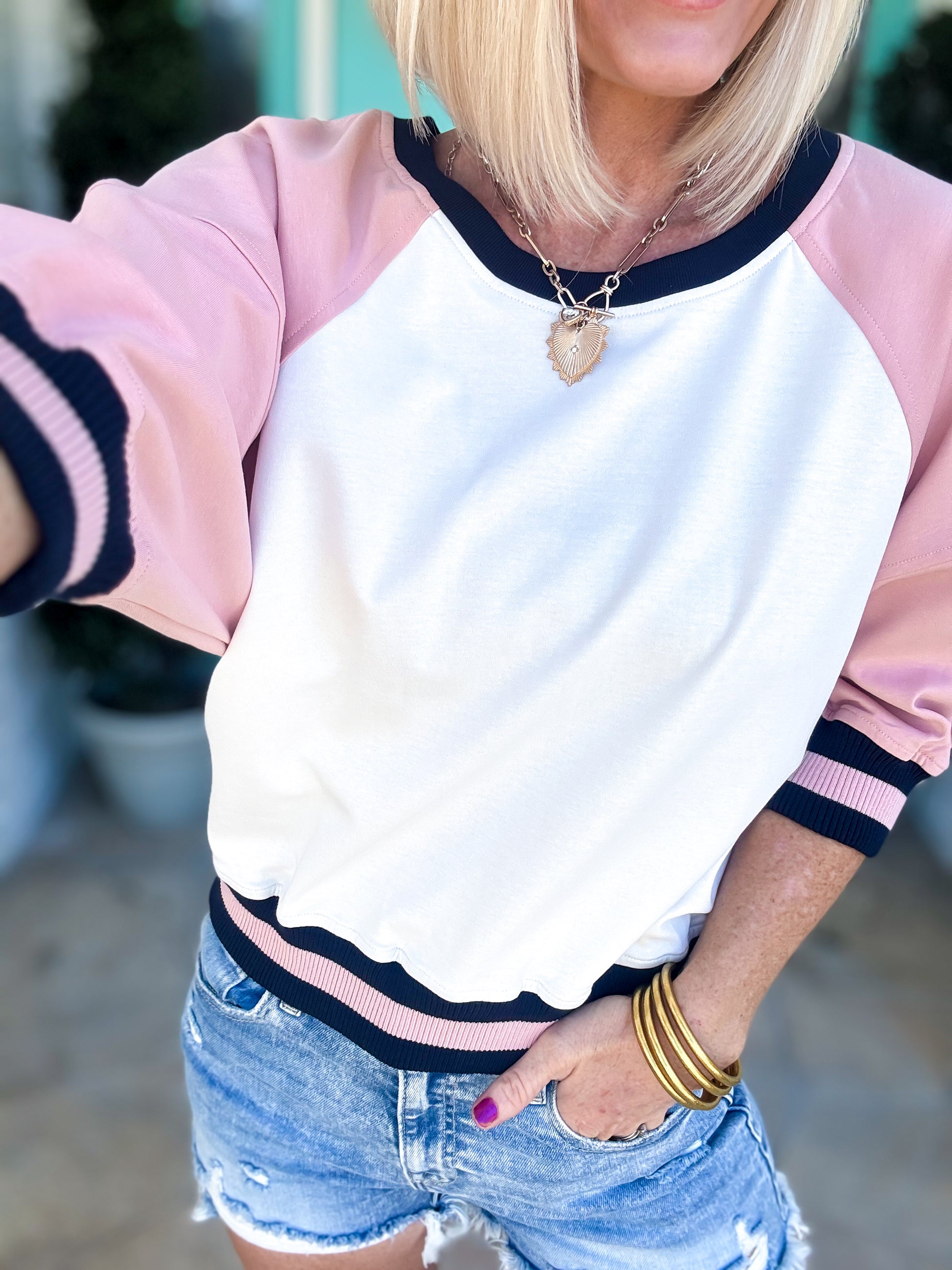 Score big in this playful green varsity top! The classic 3/4 sleeves bring that timeless athletic vibe, while the fresh green colorway keeps things modern and eye-catching. Perfect for game day, casual outings, or whenever you want to channel that spirited team spirit. Layer it, style it solo—this versatile piece is ready for anything. Go team!