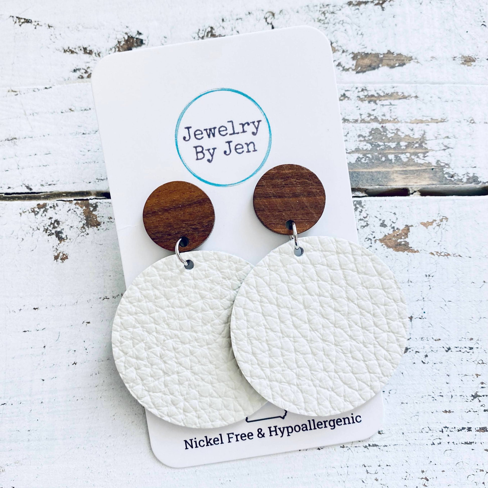 Measures 2 inches long. Wood stud earring with genuine leather circle attached. Stainless steel post. Nickel free and hypoallergenic. Due to display settings on your device, colors may appear different.